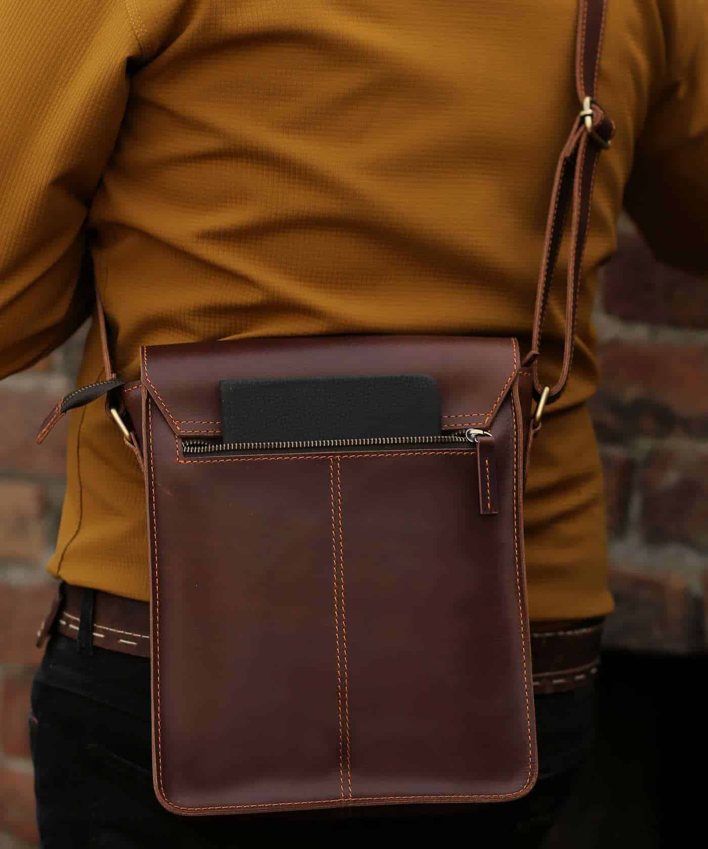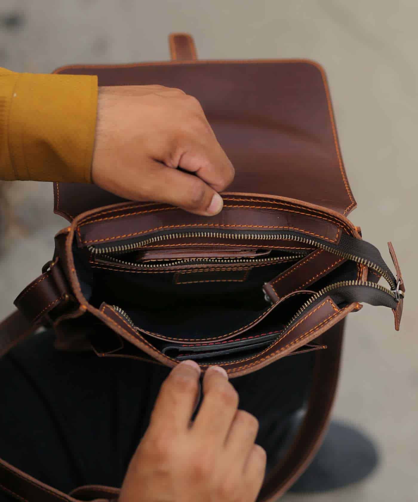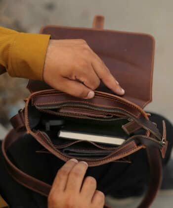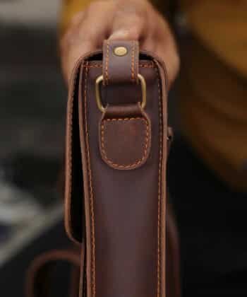 - Top flap is close in stitched leather loop which is fixed on front pocket.